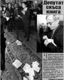 Като своеобразен черен PR или негативно-пропаганден ритуал и в началото на ХХI век се среща процедурата “изгаряне на книга”, но в актуализиран смисъл: като зрелищна акция за дискредитиране и символно умъртвяване на политическия противник. Ще спомена само едно подобно събитие от българската действителност. На 26 януари 2001 г. в НС се състоя премиера на книгата “Протестът на 39-те”, посветена на депутатите от СДС, които през 1991 г. обявиха гладна стачка срещу новата Конституция. Присъстващите стават свидетели на уникална сцена: След канонада от нецензурни реплики към авторите, депутатът от БСП Иван Генов се нахвърля върху масата с книгите и започна да ги къса една по една.